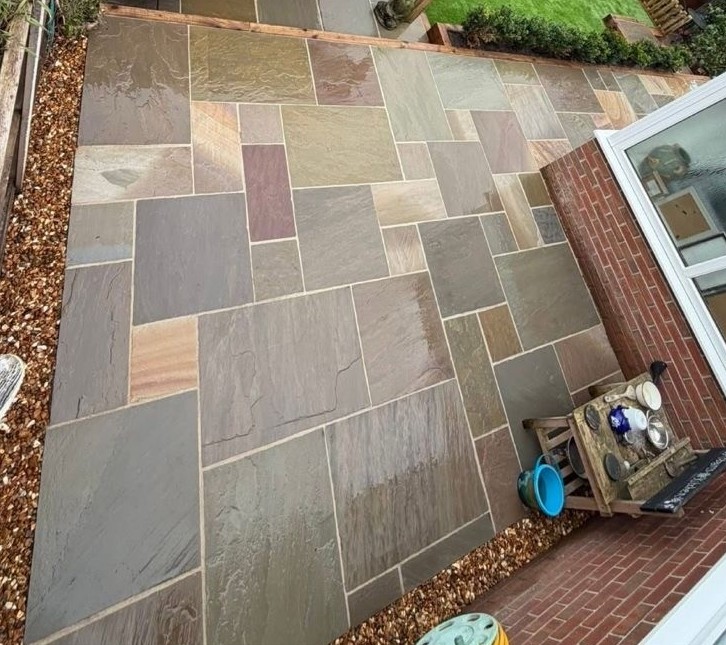 A natural sandstone paving which has an array of olive greens and browns blending seamlessly into your garden.